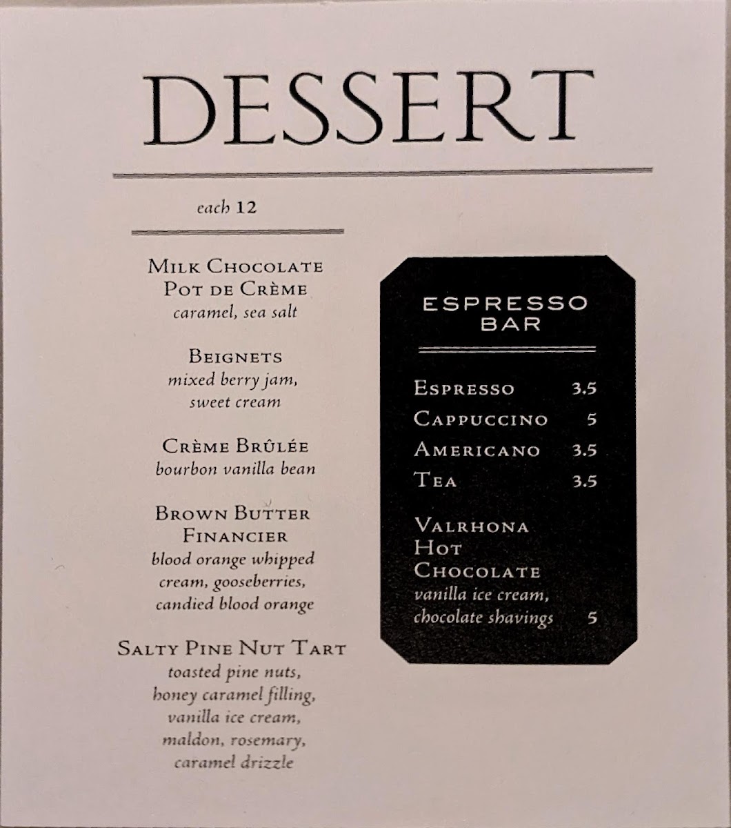 Expect a warm atmosphere where the menu supports a shared dining experience or a quiet moment at the bar. Cocktails range from classic creations to creative twists, complementing the rich and savory flavors found throughout the dishes. Thoughtful side offerings like sweet garlic soup or milk chocolate pot de crème add a gentle finish to the meal, inviting a relaxed and enjoyable pace.